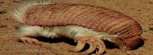 , n.m : "very small Argentine armadillo with pale silky hair and pink plates on head and neck"