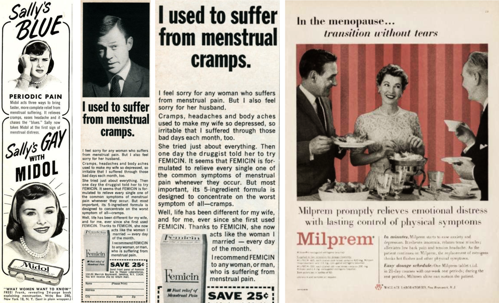 Médicaments destinés à ne plus souffrir à cause de ces foutues hormones : jeune fille, jeune femme, femme plus mature, et du coup même... homme, par une sorte d'inclusivité (très) mal placée :