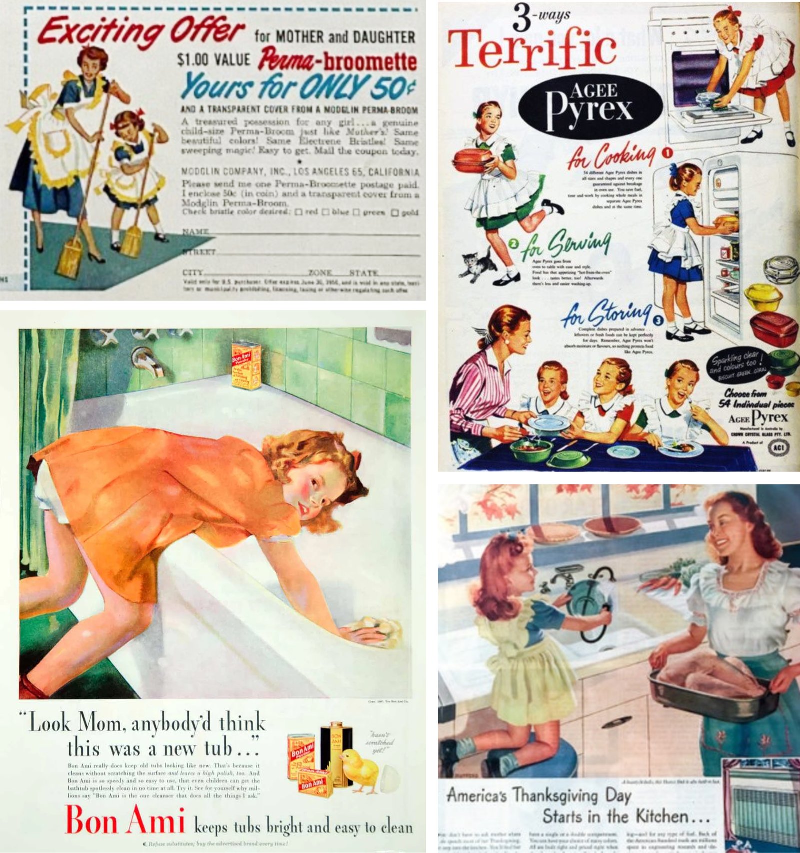 Mon billet "Copie conforme" (24 août 2025) montrait l'appétence de pubeux pour le clonage vestimentaire mère-fille ; il ne faut pas oublier que l'idée de fond est de reproduire aussi les gestes domestiques :