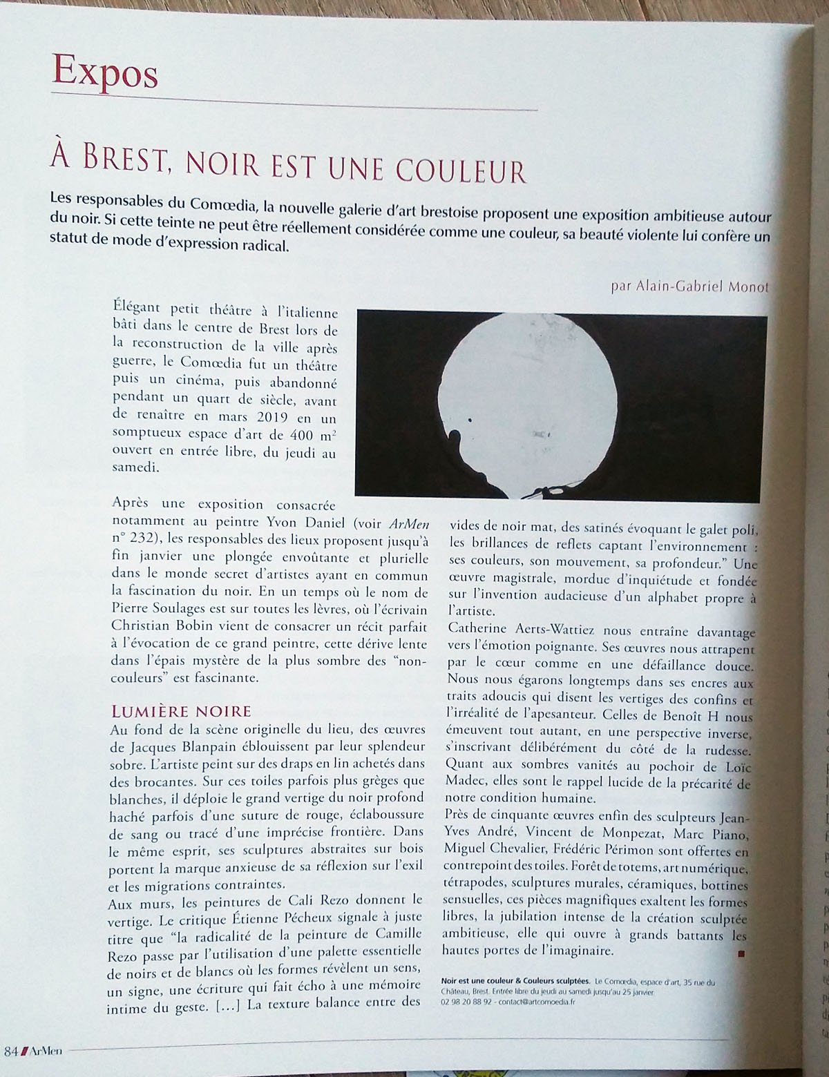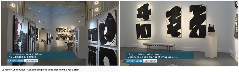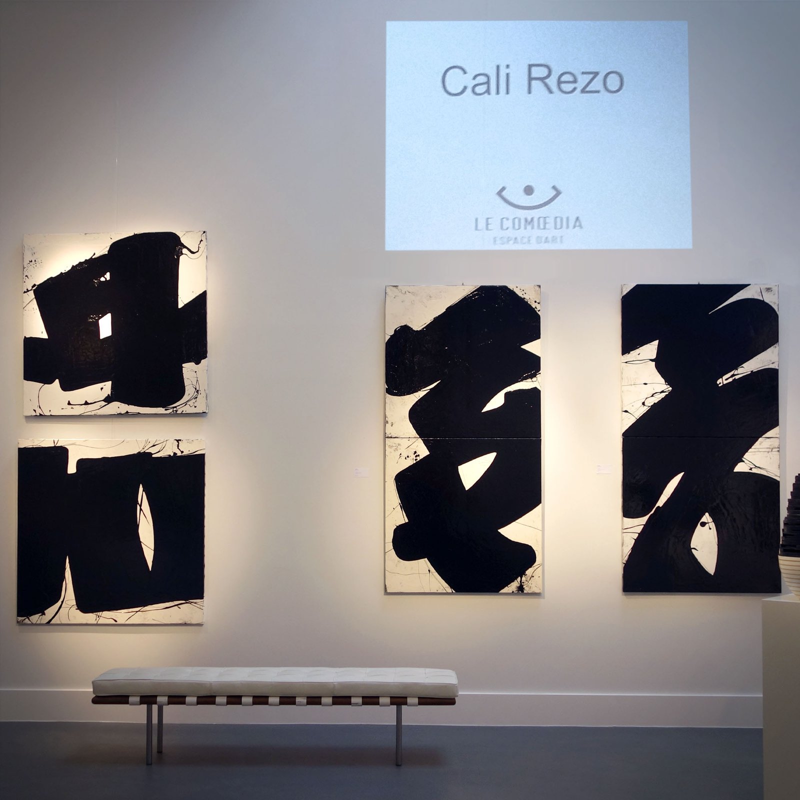 "Aux murs, les peintures de Cali Rezo donnent le vertige. Le critique Étienne Pécheux signale à juste titre que « la radicalité de la peinture de Cali Rezo passe par l’utilisation d’une palette essentielle de noirs et de blancs où les formes révèlent un sens, un signe, une écriture qui fait écho à une mémoire intime du geste. [ …J La texture balance entre des vides de noir mat, des satinés évoquant le galet poli, les brillances de reflets captant l’environnement. Ses couleurs, son mouvement, sa profondeur. » Une oeuvre magistrale, mordue d’inquiétude et fondée sur l’invention audacieuse d’un alphabet propre à l’artiste."