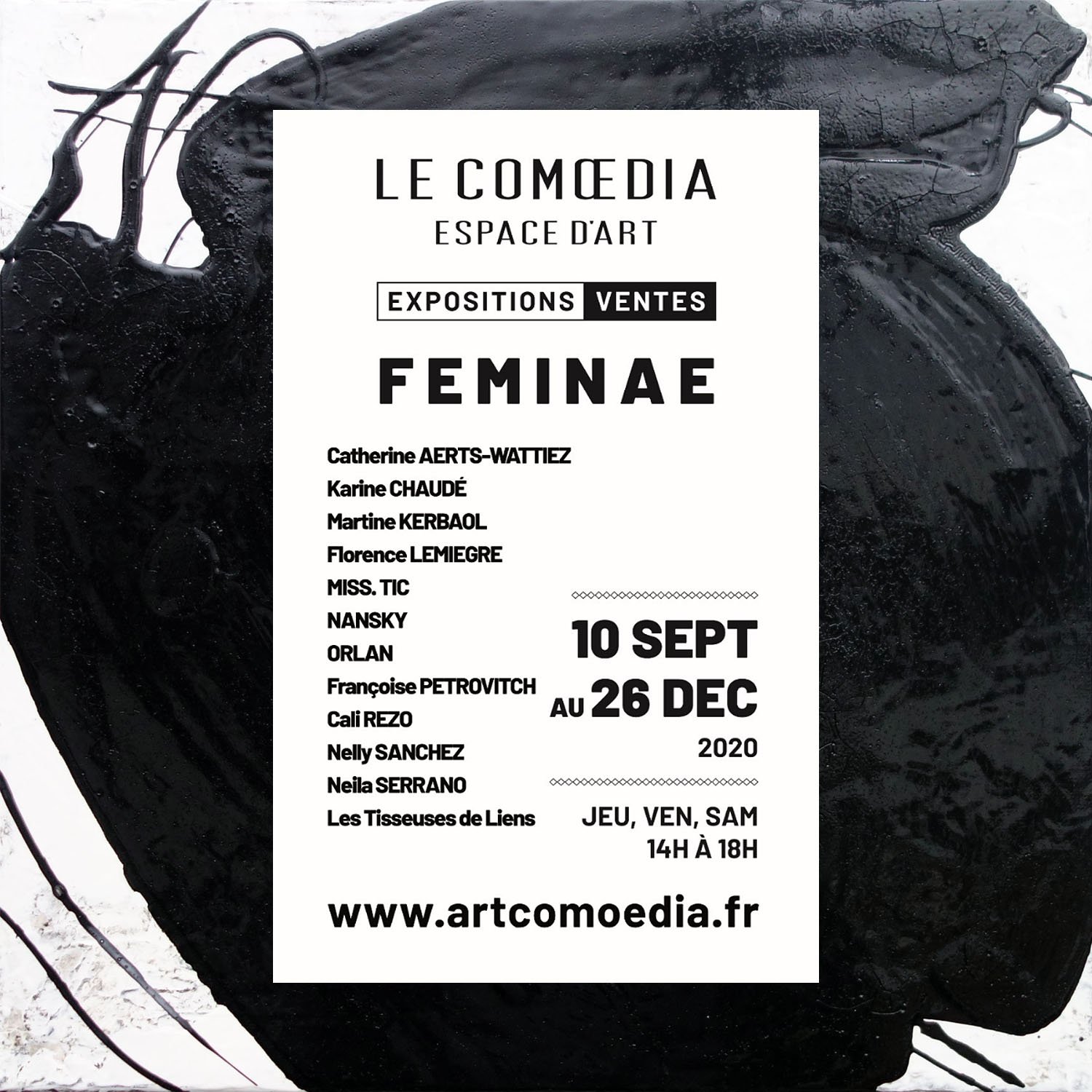 Après l'exposition collective intitulée "NOIR est une couleur" (nov 19 > janv 20) dans le splendide espace d'art le Comoedia -ancien théâtre dans le style années 40- voici mon travail de nouveau sélectionné pour l'exposition "Feminae" (10 sept. 20 > 26 déc. 20) où je serai en compagnie de 11 autres artistes (renseignements et liens ci-dessous).