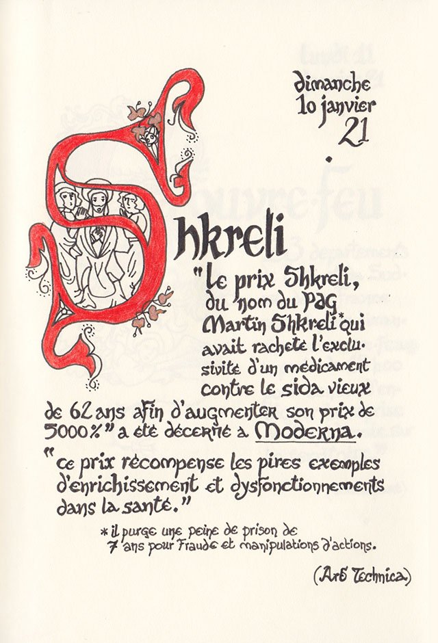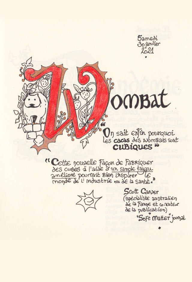 Liste des mots enluminés :Pandémie - Wombat - Oumuamua - Jarosite - Nearit - Toi-178 - N5oly - Oeuvre d’Art - Instruction - Vtol - Attention Focalisée - Bitcoin - Bouse - Adermatoglyphie - Suidé - Manchot - Pénispliquer - Ornithorynque - Cliodynamique - Couvre-Feu - Shkreli - Milliard - Résilient - Impéritie - Présentiel - Déconfinement - Niobium - Polatouche - Prescriptions culturelles - Vaccin