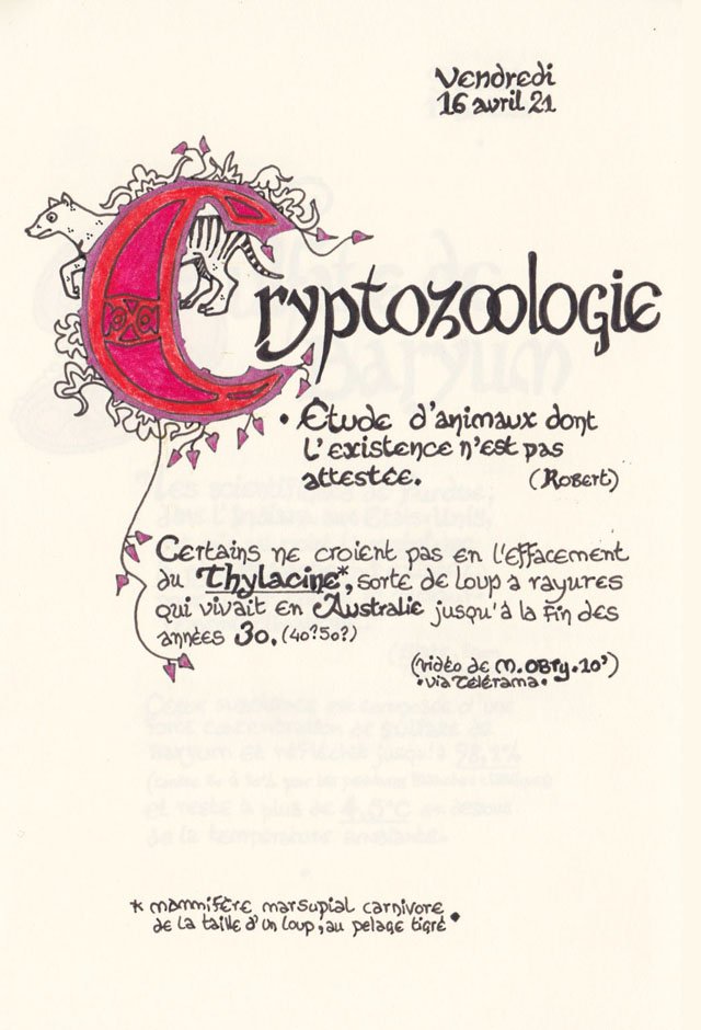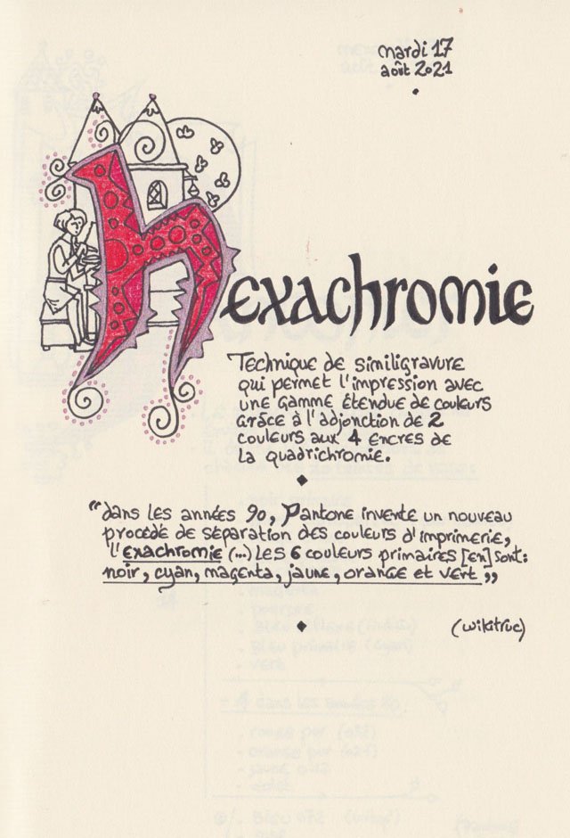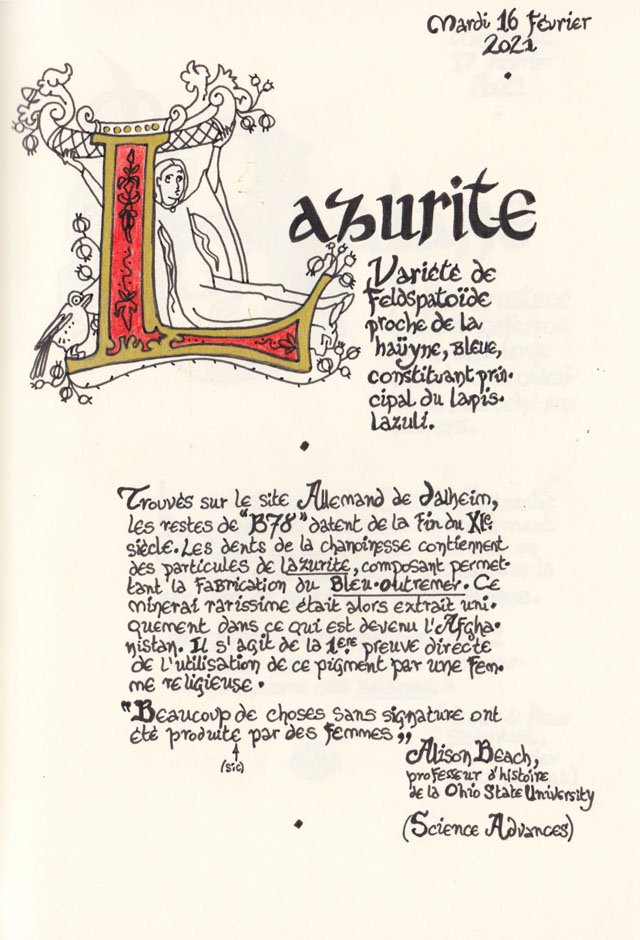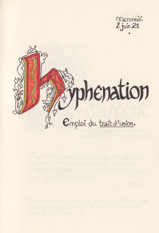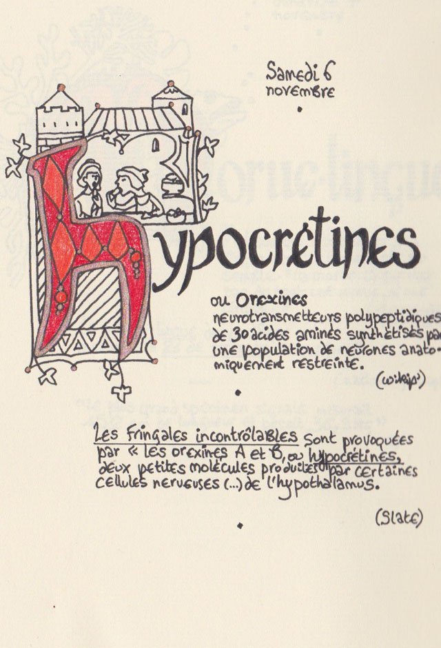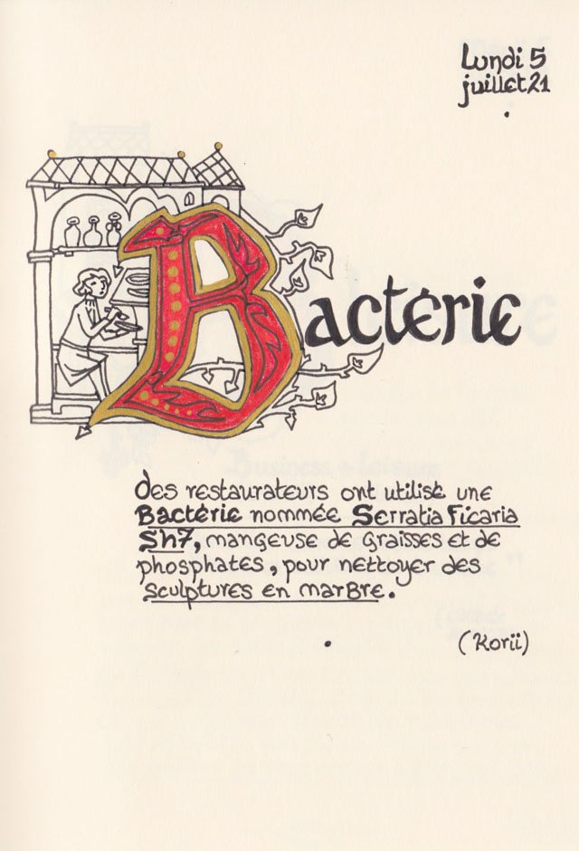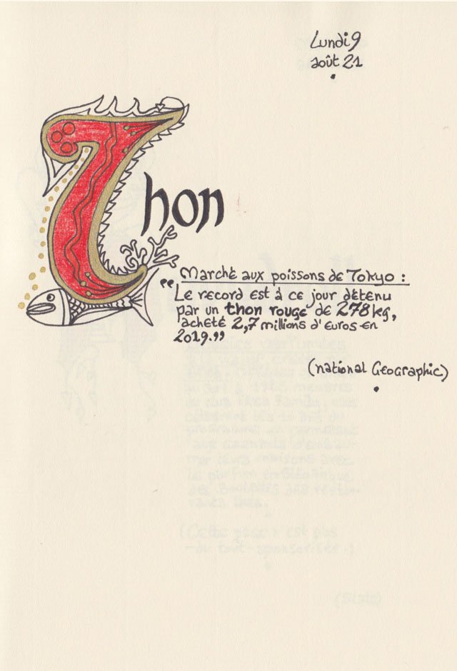 Liste des mots enluminés :Hydne Hérisson - Dipsomanie (inversion de lettres sur la lettrine dessinée due à ma distraction coutumière, désolée) - Ulnaire - Microbiote - Phragmite - Gargalesis - Cobotique - Scoville - Cténophore - Vtuber - Idiosyncrasique - Bombay - Intelligence fluide - Pantonier - Hexachromie - Photométéore - Dinosaure - Gps - Plastique - Tulou - Inventeur - Huvudroll - Thon - Hadéen - Couleurs - Gnomon - Ciborium - Stalagmite - Castatérisation - Fouloscopie - Sang des glaciers