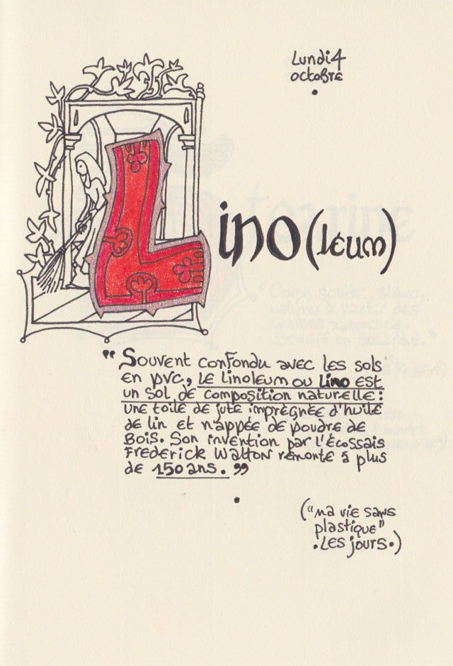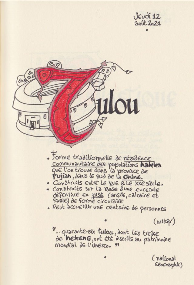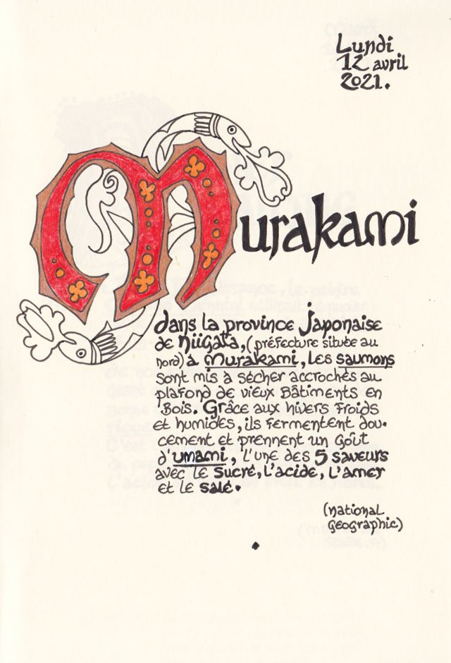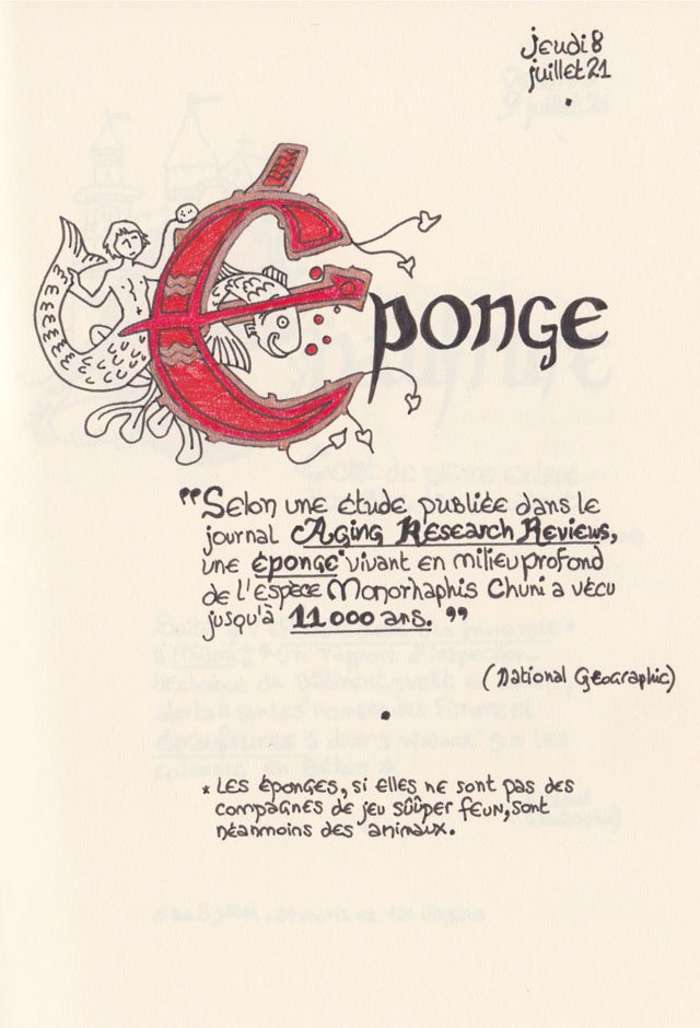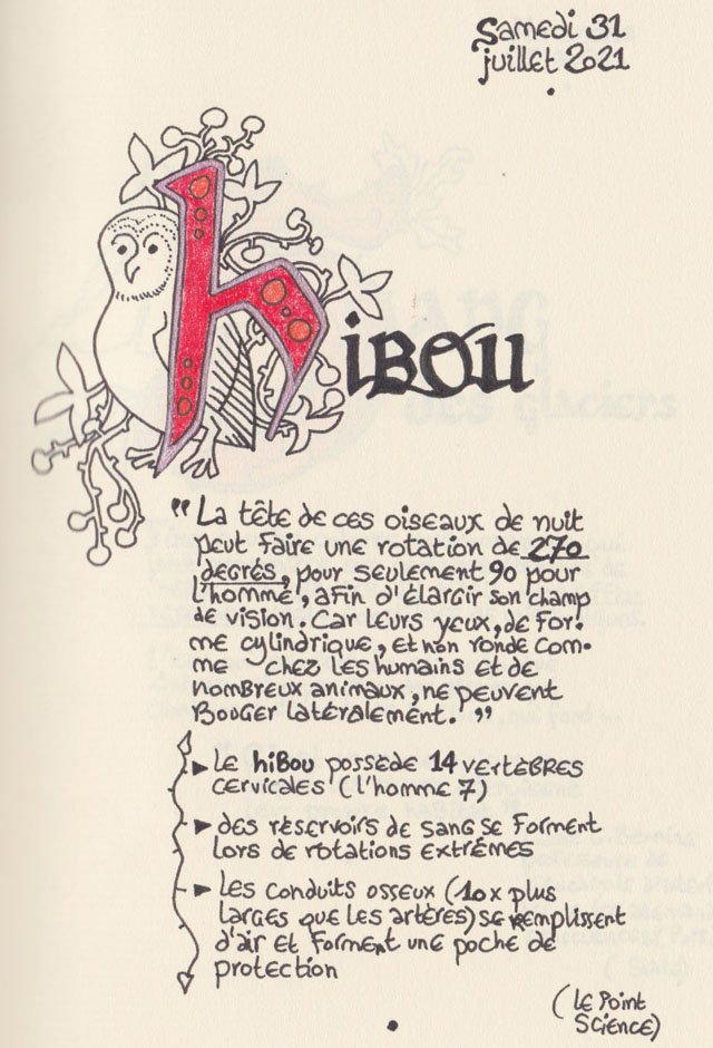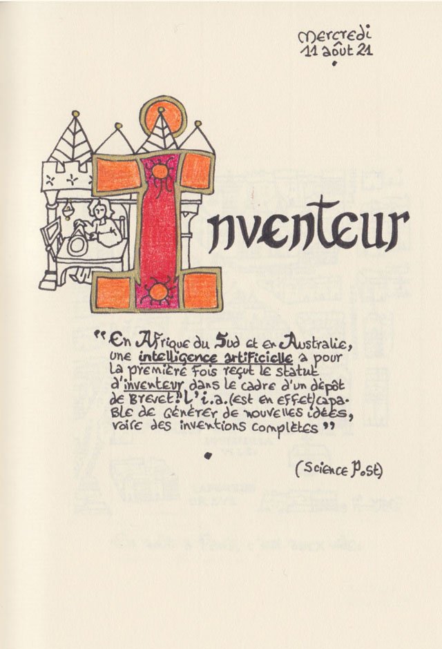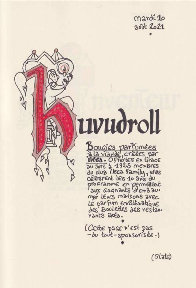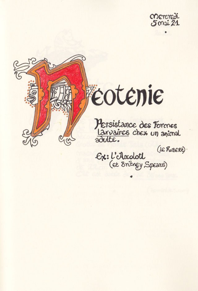 Liste des mots enluminés :Hydne Hérisson - Dipsomanie (inversion de lettres sur la lettrine dessinée due à ma distraction coutumière, désolée) - Ulnaire - Microbiote - Phragmite - Gargalesis - Cobotique - Scoville - Cténophore - Vtuber - Idiosyncrasique - Bombay - Intelligence fluide - Pantonier - Hexachromie - Photométéore - Dinosaure - Gps - Plastique - Tulou - Inventeur - Huvudroll - Thon - Hadéen - Couleurs - Gnomon - Ciborium - Stalagmite - Castatérisation - Fouloscopie - Sang des glaciers
