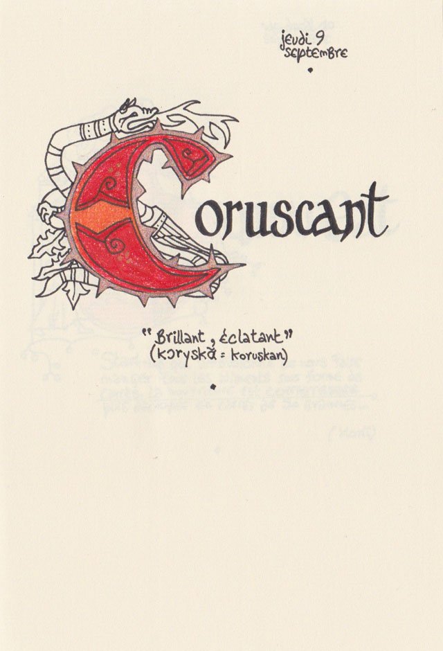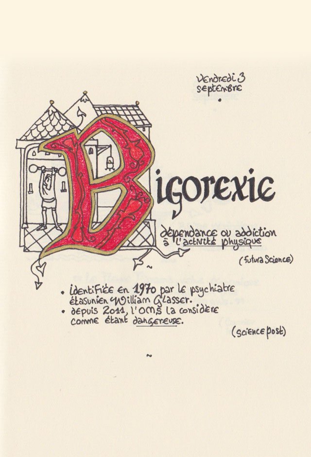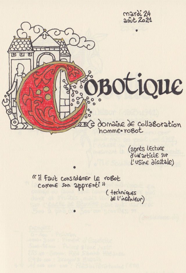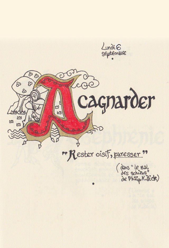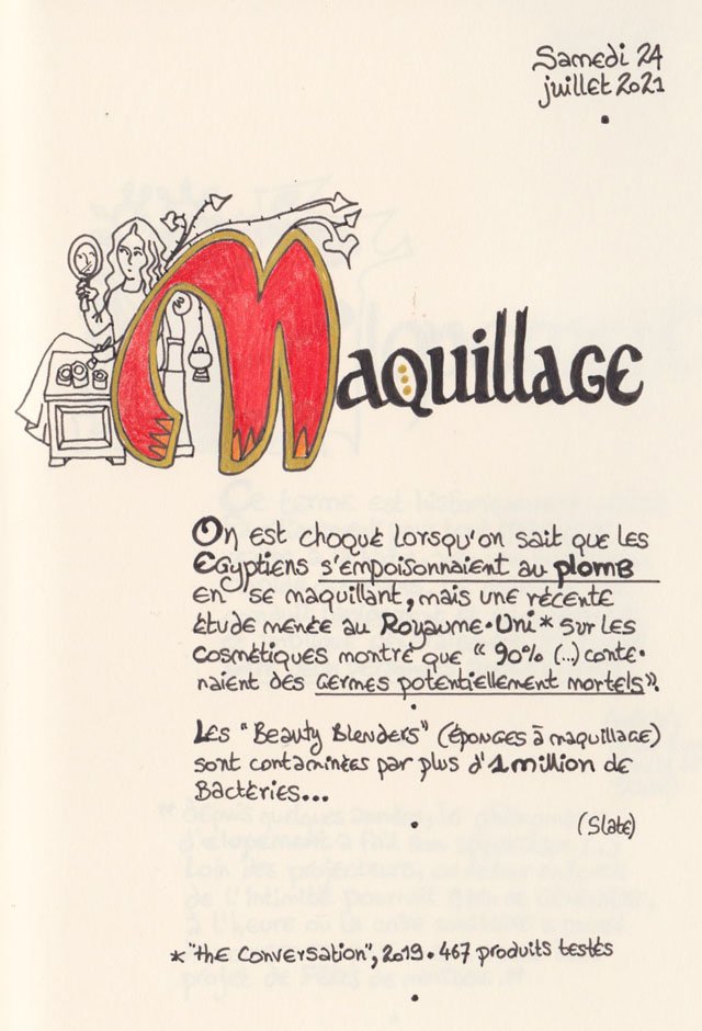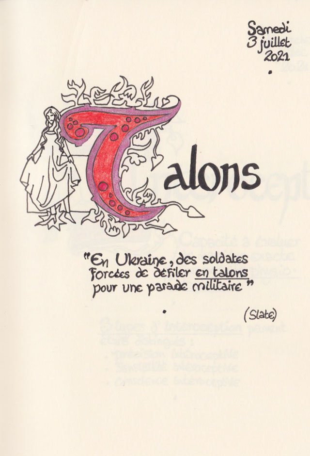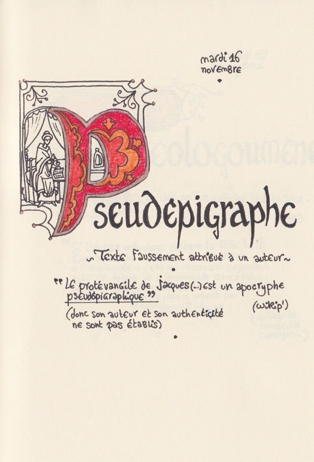 Liste des mots enluminés :Hydne Hérisson - Dipsomanie (inversion de lettres sur la lettrine dessinée due à ma distraction coutumière, désolée) - Ulnaire - Microbiote - Phragmite - Gargalesis - Cobotique - Scoville - Cténophore - Vtuber - Idiosyncrasique - Bombay - Intelligence fluide - Pantonier - Hexachromie - Photométéore - Dinosaure - Gps - Plastique - Tulou - Inventeur - Huvudroll - Thon - Hadéen - Couleurs - Gnomon - Ciborium - Stalagmite - Castatérisation - Fouloscopie - Sang des glaciers