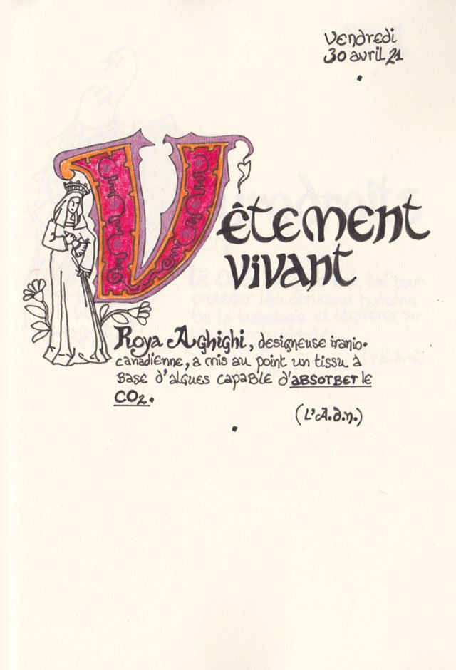 Liste des mots enluminés :Vêtements Vivants - Apocalypse - Ménopause - Shinrin-Yoku - Action Painting - Doline - Aménité - I.A. - Oxygène - Alphabet - Ecoféminisme - Congé Menstruel - Impôts - Sulfate de Baryum - Cryptozoologie - Autruche - Zizmorcore - Papier Calque - Murakami - King-Kong - Académie Royale - Syndrome d'auto-brasserie - Poisson Perroquet - Numérique - NFT - Avion - Fleurs - Pieuvre - Vaxzevria - Mea Culpa
