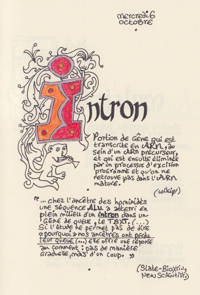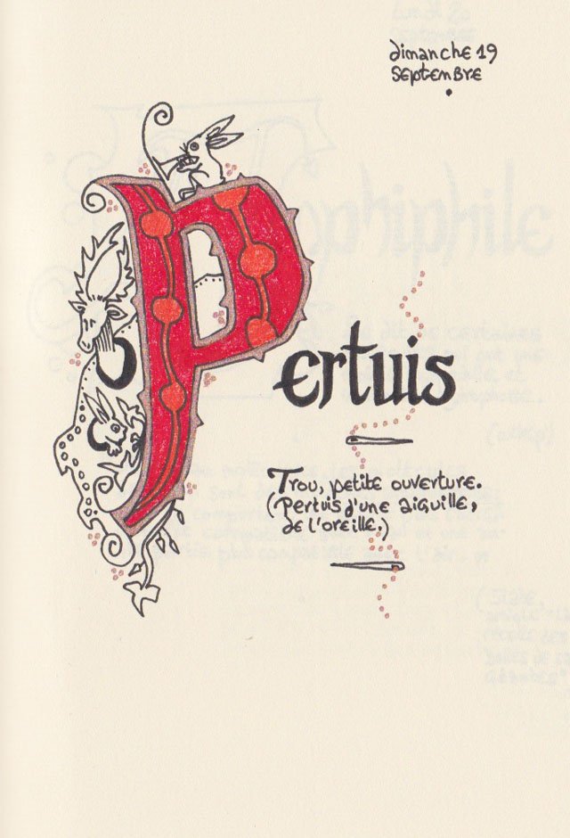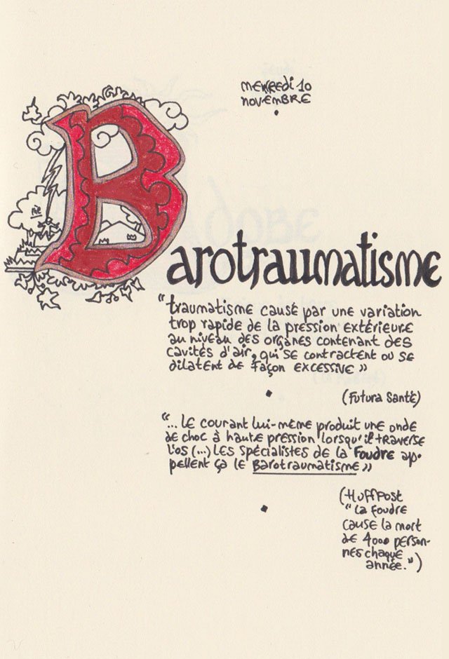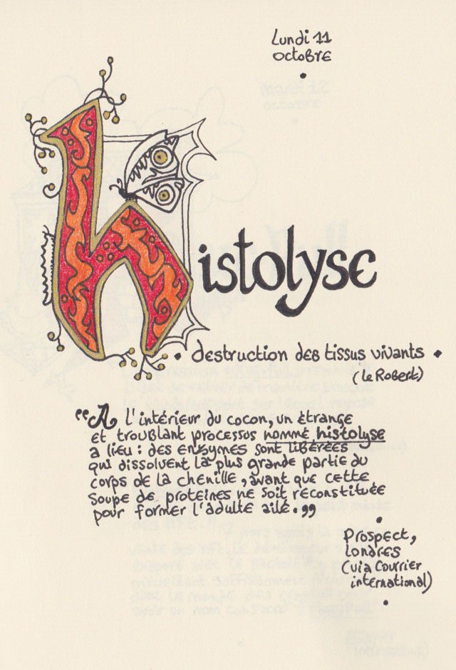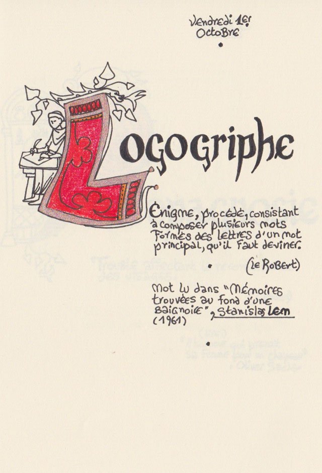 Liste des mots enluminés :Molybdomancie - Métempsychose - Canitie subite - Ecoumène - Bikini - Poisson Couteau - Ophiojura Exbodi - Métacognition - Mona Lisa - Virtuel - Compost humain - Géoglyphe - Coelacanthe - Elfe - Vanille - Finissage - Hématopoïèse - Synesthésie - Boustrophédon - Cénotaphe - Océan Austral - Polyandrie - Rêver - Panosmie - Chiton - Sculpture - Calamars - Iodure d'Argent - Hyphénation - Injonctif