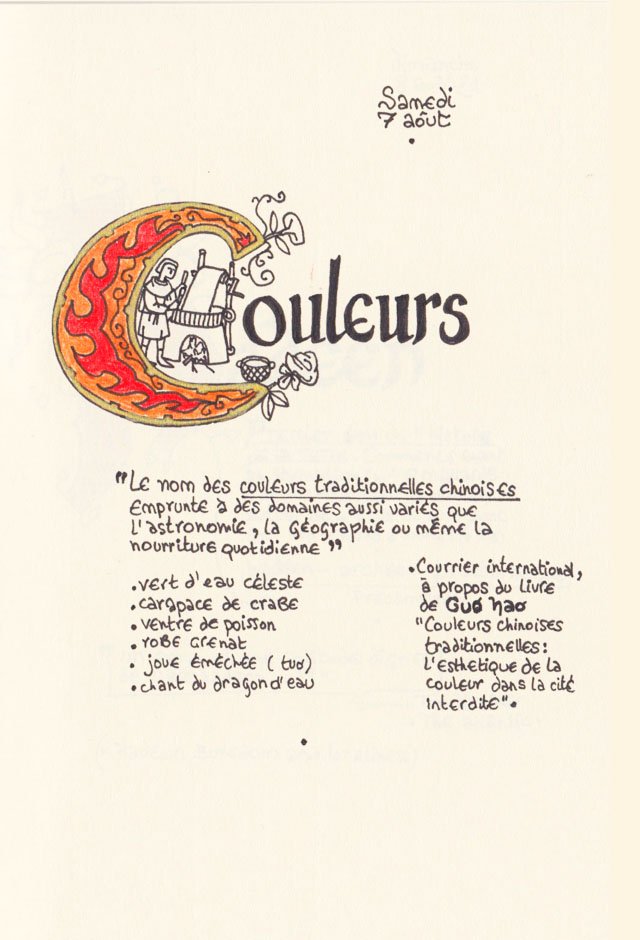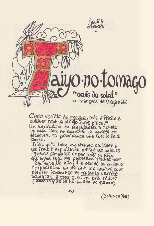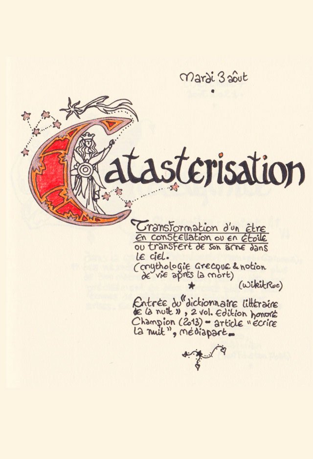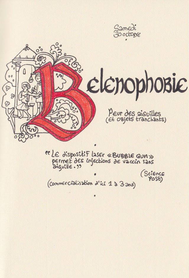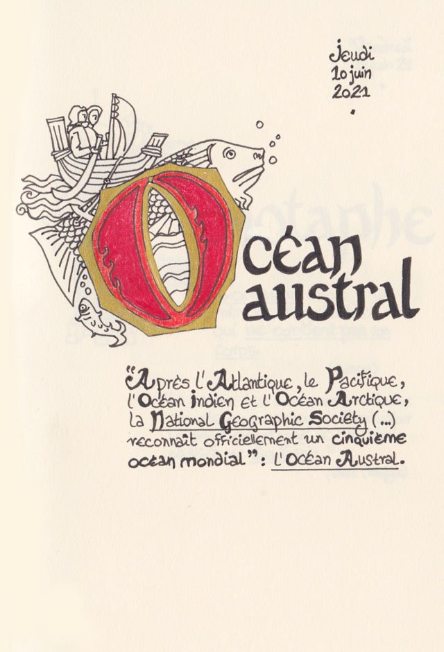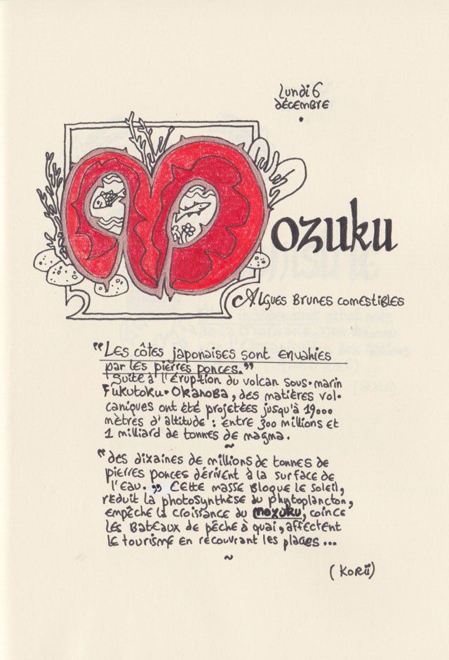 Liste des mots enluminés :Molybdomancie - Métempsychose - Canitie subite - Ecoumène - Bikini - Poisson Couteau - Ophiojura Exbodi - Métacognition - Mona Lisa - Virtuel - Compost humain - Géoglyphe - Coelacanthe - Elfe - Vanille - Finissage - Hématopoïèse - Synesthésie - Boustrophédon - Cénotaphe - Océan Austral - Polyandrie - Rêver - Panosmie - Chiton - Sculpture - Calamars - Iodure d'Argent - Hyphénation - Injonctif
