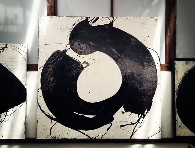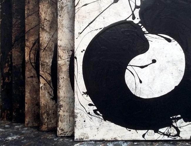 I eventually laid down my shiny black “nests” on these well-prepared backgrounds, each of them finding its place in the various tones; each of them reflecting the world in its own way.