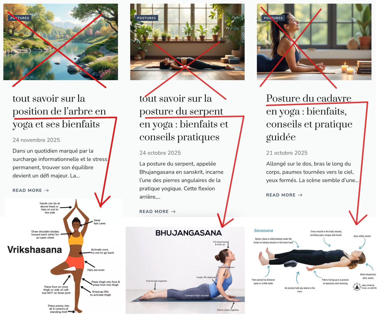 En cherchant une position optimale de yoga, je suis tombée sur un site dont les articles, vraisemblablement pondus par IA, ne semblent même pas relus par des humains. Et pourtant, un simple coup d'oeil aux images accompagnant les titres ne fait aucun doute sur les noeuds crées au cerveau artificiel au moment des prompts :