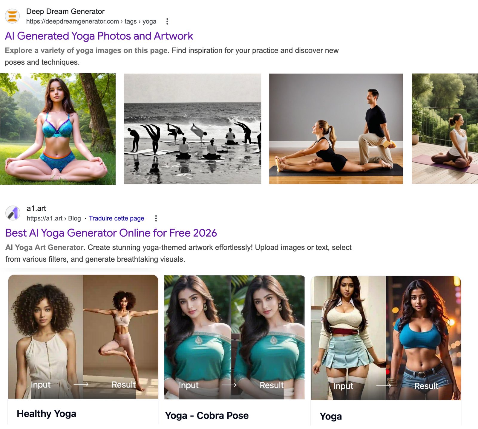 Et même si l'évolution de l'IA en à peine 2 ans est considérable, le yoga semble encore donner du fil -et des corps- à retordre aux machines. Voici une sélection d'images prises sur les pages d'entrées de sites permettant de prompter insolemment du yoga :