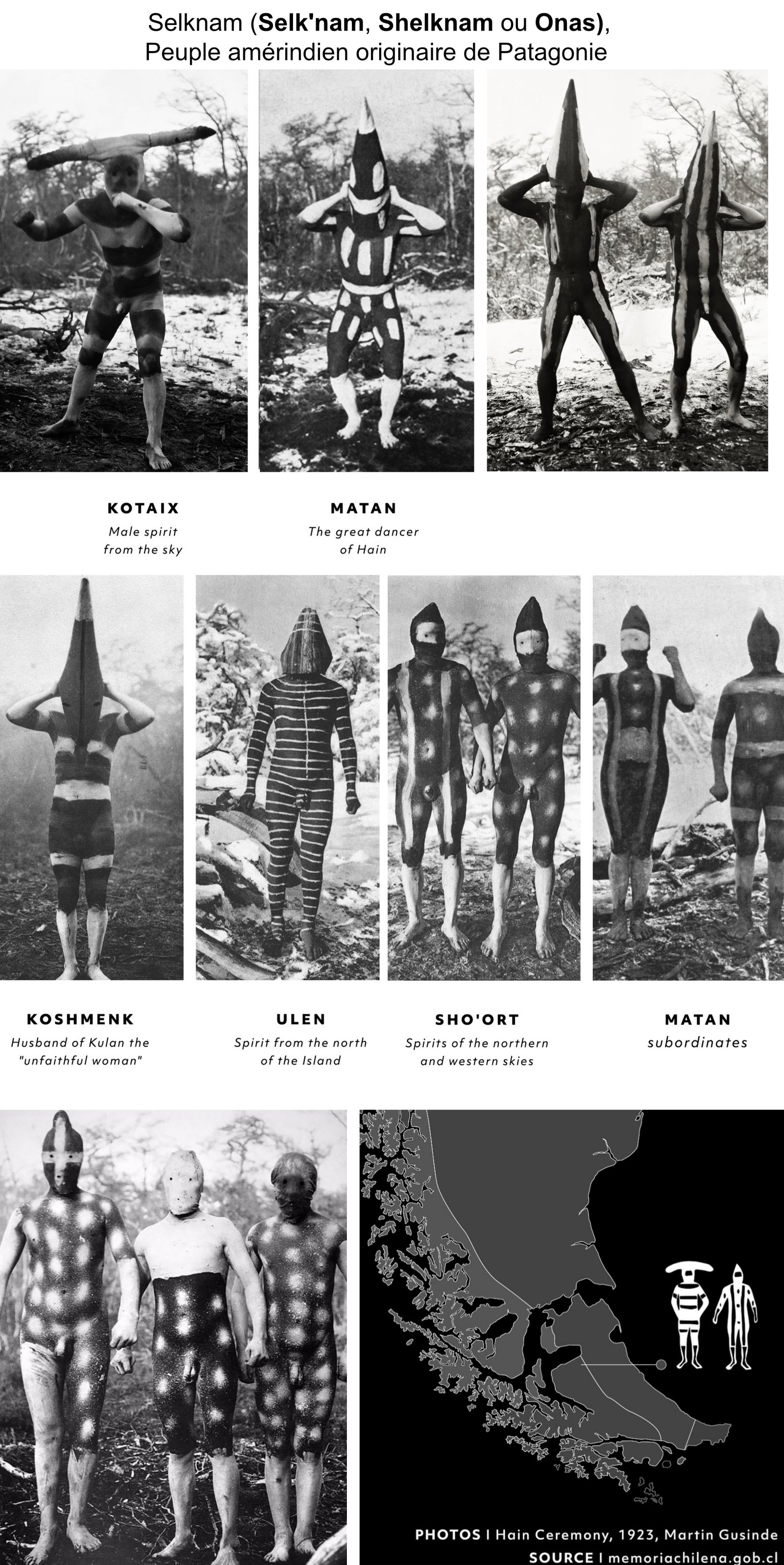 Les Selknam, aussi appelés Selk'nam, Shelknam ou Onas (par les Yagans), forment un petit peuple amérindien originaire de la Grande Île de Terre de Feu longtemps dit disparu après les effets dévastateurs de la colonisation... (suite sur Wikipédia)